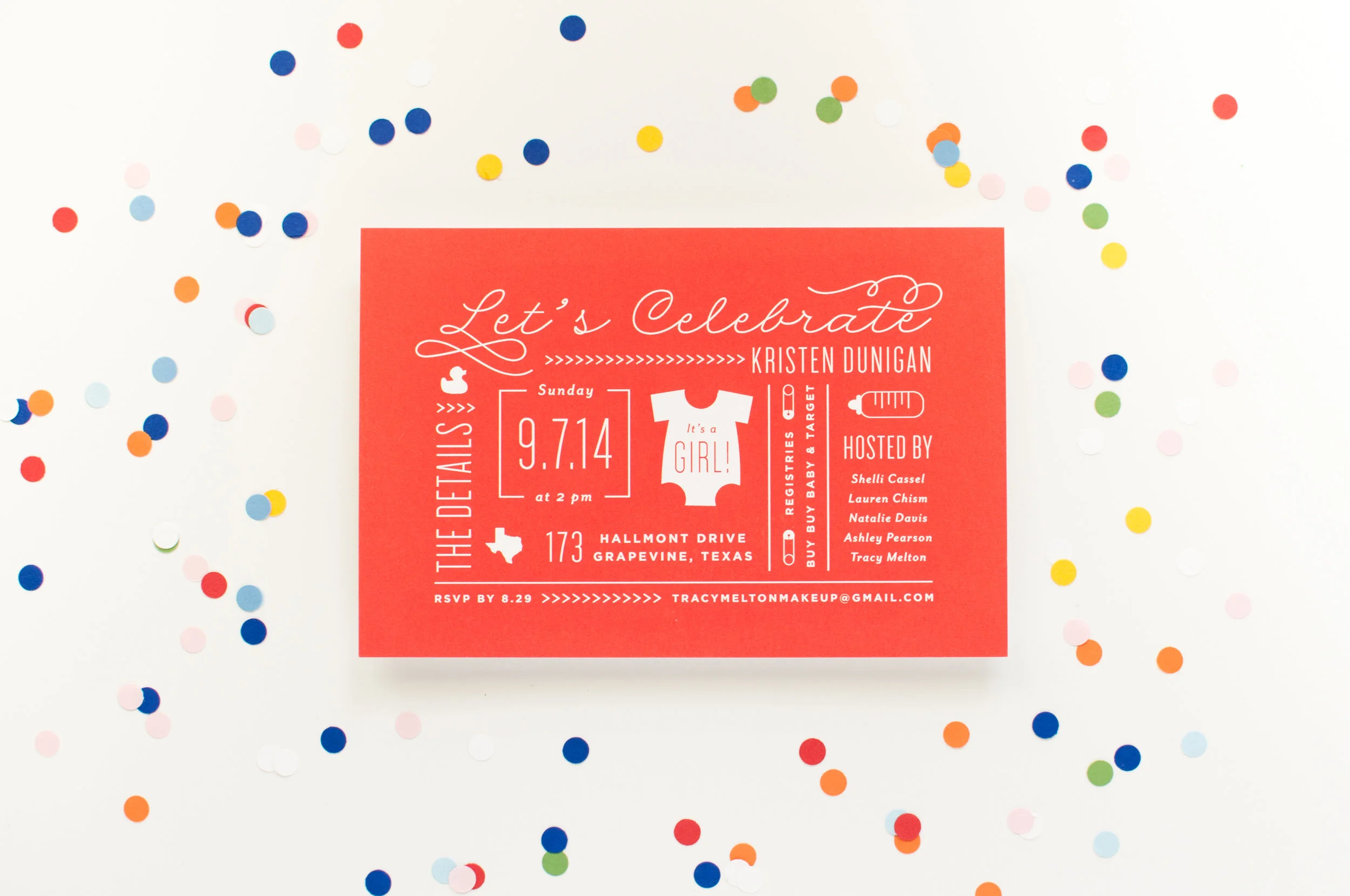 I am so excited to share these baby shower invitations that I designed for my friend, Kristen! Kristen is a fun, color-loving gal, and so her shower invitations needed to be the same. Read more about the design on the Oh So Beautiful Paper feature.